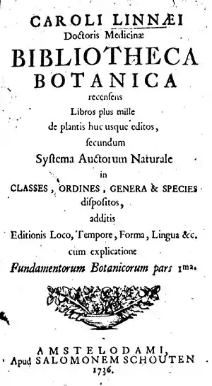 ![]() Титульный лист первого издания работы Карла Линнея Bibliotheca Botanica | |