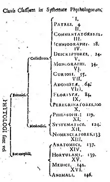 Начинается книга с предисловия, в котором Линнеем коротко изложена история ботаники, а затем приведена система классификации ботаников. На основании последней указаны 16 библиографических разделов, каждый из которых, в свою очередь, делится на несколько подразделов. Перечни разделов и подразделов одновременно выполняют функции оглавлений, поскольку для каждого раздела и подраздела указывается страница, с которой он начинается[10]. Все классификационные группы имеют краткие, но ёмкие характеристики; краткие характеристики приведены и для многих авторов ботанических сочинений[5].