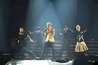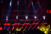 ![]() Big Bang на пресс-конференции документального фильма «Big Bang Made», июнь 2016 года. Слева направо: Сынни, T.O.P, Тхэян, G-Dragon и Тэсон | |