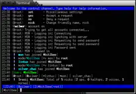 ![]() Скриншот irssi, соединенного с Bitlbee сервером для общения через Windows Live Messenger | |
