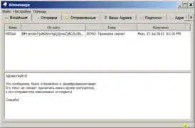 Bitmessage — криптографический мессенджер с открытым исходным кодом, использующий децентрализованную P2P-сеть, написанный на C++ и Python. Сеть Bitmessage сходна с сетью Bitcoin тем, что опирается на криптографию и жертвует некоторым удобством ради безопасности и децентрализации, однако она предназначена для задачи пересылки сообщений, а не денежных транзакций. Сеть получила резкий всплеск популярности[3] после разглашений Эдварда Сноудена о системе тайного слежения за интернет-пользователями PRISM.