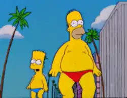 Гомер и Барт шагают по пляжу после требования спасателя соблюдать местный дресс-код | |