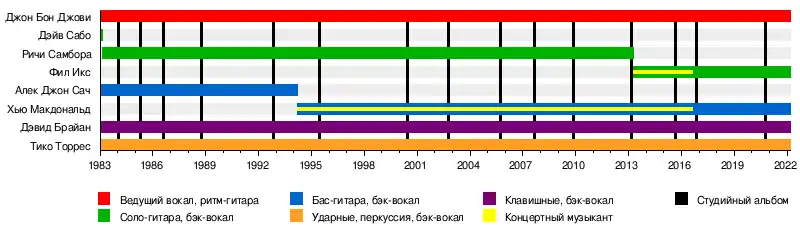 Bon Jovi — американская рок-группа из Нью-Джерси, образованная в 1983 году. В состав коллектива входят вокалист Джон Бон Джови, клавишник Дэвид Брайан, бас-гитарист Хью Макдональд, гитарист Фил Икс и барабанщик Тико Торрес[6]. На протяжении многих лет состав группы практически не менялся, лишь в 1994 году от них ушёл басист Алек Джон Сач, которого заменил Хью Макдональд. В 2013 году группу покинул гитарист Ричи Самбора[7]. В 2016 году Хью Макдональд и Фил Икс стали полноправными участниками коллектива. Всемирной популярности Bon Jovi поспособствовал альбом Slippery When Wet (1986). В 1990 году, после плотных гастрольных туров и большого количества хитов, группа приостановила деятельность; тогда же Джон Бон Джови и Самбора выпустили по сольному альбому. В 1992 году был выпущен альбом Keep the Faith. Их песня 2000 года «It’s My Life» смогла привлечь внимание более молодой аудитории. Bon Jovi использовали разные стили в своей музыке: так, альбом Lost Highway (2007) включал элементы кантри. Последний на данный момент релиз группы, 2020, был выпущен 2 октября 2020 года.