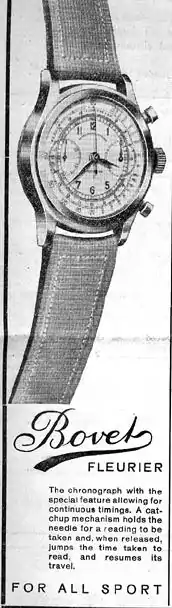 Модели хронографов Bovet, производившиеся до середины XX столетия, были, в отличие от более ранних часов для китайского рынка, утилитарными, а не декоративными. Наручные хронографы под маркой Bovet, продававшиеся Bovet Freres в начале 1940-х годов[24], а затем Favre-Leuba с 1948 по 1950, содержали некоторое количество деталей механизма, производившихся другими компаниями. Вначале надпись на циферблате часов Bovet Freres представляла собой название компании, выполненное стандартным шрифтом, но в начале 1940-х она была заменена на стилизованный логотип без слова Freres[24]. Когда Favre-Leuba купила компанию, логотип был заменён на надпись Bovet сначала обычным шрифтом, а затем стилизованным. В процессе отказа от бренда Bovet выпускались часы с совмещёнными названиями Favre-Leuba и Bovet[25].
