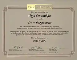 - Бесплатные — тесты, не требующие оплаты и после окончании которых выдается сертификат[2] (высылается в бумажном виде на географический почтовый адрес клиента).