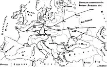 - Север-Юг-Параллель: Столица мира Германия (Берлин) — Дрезден — Усти-над-Лабем — Прага — Йиглава — Зноймо — Вена — Триест — Рим