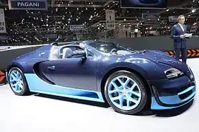 Bugatti Veyron — гиперкар компании Bugatti, производившийся с 2005 по 2015 год. Назван в честь французского легендарного гонщика Пьера Вейрона, победителя 1939 года в гонках 24 часа Ле-Мана[1]. В 2010 году журналы Top Gear и Robb Report присудили награду «Автомобиль десятилетия» Bugatti Veyron и модификации Grand Sport соответственно[2]. Модификация Super Sport в 2010 году побила мировой рекорд скорости и стала самым быстрым серийным автомобилем в мире[3]. Производство Veyron на данный момент завершено, всего было продано 450 автомобилей: 300 купе и 150 родстеров[1]. Его преемником является Bugatti Chiron, официально представленный на женевском автосалоне в 2016 году.