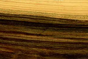 Ядровая древесина бывает коричневой, чёрной и зелёной (от светло-оливкового зелёного до шоколадно-коричневого, поверхность свежей древесины часто становится тёмно-зелёной под воздействием света), с полосами. Заболонь обычно тонкая, светло-жёлтая. Плотность этой древесины колеблется от 920 до 1100 кг/м³. Текстура древесины имеет очень выразительный полосатый рисунок, создаваемый расположенными в узких зонах разнонаправленными волокнами с переменным углом по отношению к сосудам .