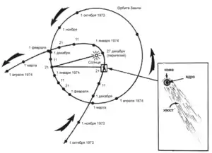 В 1974 году на расстоянии около 100 млн км от ядра через хвост кометы прошел аппарат НАСА «Пионер-6», передавший данные о его составе. Также в этом исследовании принимал участие «Пионер-8», но с гораздо большего расстояния.
