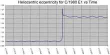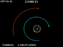 9 декабря 1980 года она прошла в 0,228 а. е. от Юпитера[4], что на короткое время ускорило её и получила (эпоха 9 января 1981) эксцентриситет 1,066. Комета прошла перигелий 12 марта 1982 года[5] , имея скорость 23,3 км/с относительно Солнца. С эпохи 4 марта 1977 C/1980 E1 имеет барицентрический эксцентриситет больше 1[3], удерживаясь на гиперболической траектории, которая выбрасывает её из Солнечной системы. Объекты на гиперболических орбитах имеют отрицательную большую полуось, что придаёт им положительную орбитальную энергию. После выхода из Солнечной системы C/1980 E1 будет иметь межзвёздную скорость () 3,77 км/с[lower-alpha 1]. Центр малых планет не указывает напрямую большую полуось этой кометы[6].
