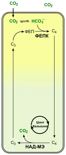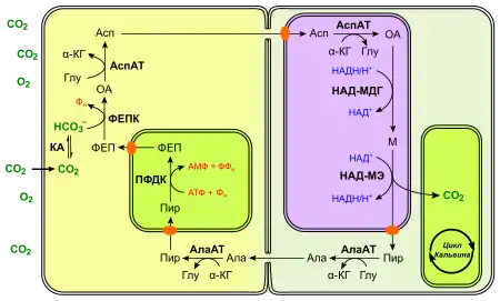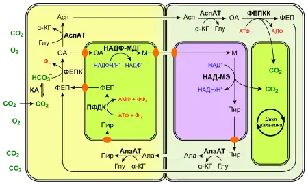 Оксалоацетат, который образуется в результате карбоксилирования ФЕП, с помощью специфичного переносчика транспортируется в хлоропласты, где восстанавливается НАДФ-малатдегидрогеназой до малата. Образовавшийся малат выносится в цитозоль и диффундирует из клеток мезофилла в клетки обкладки через плазмодесмы. Малик-энзим, который локализован в хлоропластах клеток обкладки, катализирует преобразование малата в пируват с выделением СO2, который фиксируется Рубиско. Образовавшийся пируват с участием специфичного переносчика экспортируется из хлоропластов клеток обкладки и диффундирует через плазмодесмы в клетки мезофилла, где он с помощью другого переносчика входит в хлоропласты, где фермент пируватфосфатдикиназа снова превращает его в ФЕП[13].