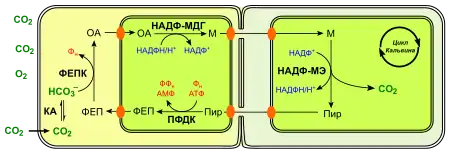 - ФЕП-карбоксикиназный тип: Малат декарбоксилируется в митохондриях по НАД-малатдегидрогеназному типу, но также имеет место и прямое декарбоксилирование оксалоацетата в цитоплазме ФЕП-карбоксикиназой с затратой одной молекулы АТФ и образованием ФЕП.