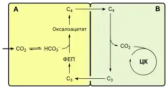 ФЕП-карбоксилаза катализирует необратимую конденсацию молекул ФЕП и HCO3− с образованием оксалоацетата. ФЕП-карбоксилаза имеет очень высокое сродство к ФЕП. Оксалоацетат преобразуется в малат или же в аспартат и в таком виде транспортируется в клетки обкладки, где снова становится малатом и подвергается окислительному декарбоксилированию:
