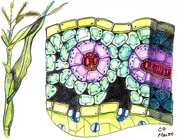 Для C4-растений характерна особая структура листа, так называемая кранц-анатомия (нем. Kranz — корона, венец). Впервые такой тип строения листа был описан в 1884 году немецким ботаником Готлибом Габерландтом[8]. Проводящие пучки у таких растений окружены двумя слоями зелёных клеток ассимиляционной паренхимы. Внешний слой образуют клетки мезофилла, не дифференцированного на губчатую и палисадную паренхиму, а внутренний — клетки обкладки сосудистого пучка. Клетки обкладки связаны с клетками мезофилла множеством плазмодесм, благодаря чему между ними возможен активный обмен метаболитами. Особенностью строения листа C4-растений является наличие не более 2-3 слоёв клеток мезофилла, что позволяет легко обмениваться продуктами фотосинтеза через плазмодесмы. Клетки мезофилла и клетки обкладки проводящего пучка отличаются структурно и функционально. Клетки мезофилла мелкие, расположены рыхло, хлоропласты в них всегда имеют граны и они редко содержат крахмал. В этих клетках и располагается ФЕП-карбоксилаза, которая присоединяет CO2 к фосфоенолпирувату с образованием оксалоацетата. Клетки обкладки более крупные, с утолщённой, часто суберинизированной, клеточной стенкой, плотно прилегают к сосудам листа, хлоропласты в них могут не иметь гран и часто содержат зёрна крахмала. Здесь локализуется фермент Рубиско и протекает обычный цикл Кальвина[9].