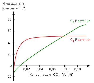 С4-растения обладают эффективным механизмом ассимиляции CO2 через фермент ФЕП-карбоксилазу и слабым фотодыханием, поэтому их точка компенсации CO2 стремится практически к нулю (< 0,001 объёмных процентов CO2[60]). Как видно из графика, скорость фотосинтеза у С4-растений при низком содержании CO2 возрастает значительно быстрее, чем у С3, поэтому при низких концентрациях углекислого газа С4-растения всегда имеют конкурентное преимущество. Для большинства высших C3-растений точка компенсации СО2 находится при довольно высоких концентрациях и составляет 0,005—0,015 % CO2[61] в окружающем воздухе.