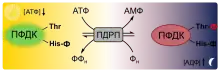 Пируватфосфатдикиназа (ПФДК) также является светозависимым ферментом. Она инактивируется в темноте за счёт фосфорилирования по остатку треонина. Эту реакцию осуществляет необычный бифункциональный ПФДК-регулирующий протеин (ПФДК-РП или ПДРП). Он одновременно обладает киназной и фосфатазной активностью. Фосфорилирование довольно необычно, поскольку в качестве донора фосфатной группы используется предпочтительно АДФ, а не АТФ. Необычна и реакция дефосфорилирования: вместо молекулы воды ПФРП переносит отщепляемую фосфатную группу на свободный неорганический фосфат (Фн) с образованием пирофосфата (ФФн). Активность ПДРП зависит от уровня АДФ в строме хлоропластов. АДФ является субстратом для киназной активности и одновременно сильным конкурентным ингибитором фосфатазной. В темноте уровень АДФ значительно повышается, в результате чего подавляется фосфатазная активность. На свету, за счёт фотофосфорилирования, концентрация АДФ резко сокращается, не остаётся субстрата для киназной реакции, а фосфатазная перестаёт подавляться. В результате ПДРП отщепляет фосфат от пируватфосфатдикиназы и активирует её[33].