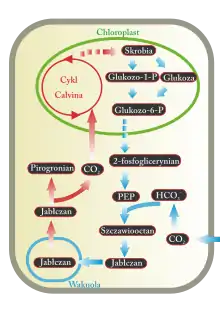- Фаза 3. Следующую часть дня устьица закрыты в целях ограничения утраты воды. В цикл Кальвина заходит CO2, полученный путём декарбоксилирования вышедшего малата. Это процесс может осуществляться одним или несколькими энзимами: яблочный энзим, зависящий от НАДФ; яблочный энзим, зависящий от НАД или ФЕП-карбоксикиназы (ФЕП-КК)[8]. Во время декарбоксилации высвобождается CO2 и пируват. Углекислый газ используется для образования углеводов, а пируват повторно превращается в сахар в процессе глюконеогенеза[9].