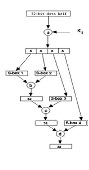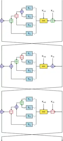 | Раунды 2,5,8,11,14 | I = ((Kmi ^ Ri-1) <<< Kri) F = ((S1[Ia] - S2[Ib]) + (S3[Ic])) ^ S4[Id] |