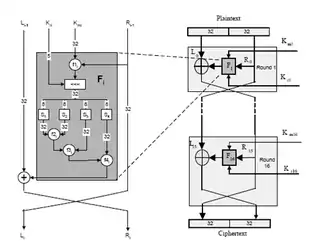3. (16 раундов) for i from 1 to 16, вычислить Li и Ri следующим образом: Li = Ri-1; Ri = Li-1 ^ F(Ri-1,Kmi,Kri), где F определена в разделе «Пары раундовых ключей» (F имеет тип 1, тип 2, тип 3 или, в зависимости от i).