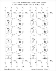 В часть обработки данных CLEFIA, состоящую из для шифрования и для расшифрования, входят процедуры исключающее «или» между текстом и отбеливающими ключами в начале и в конце алгоритма.