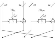 Каждая ячейка Фейстеля задействует также две различные -функции: . -функции относятся к SP-типу функций и используют: