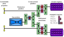 Относительно маломощный двигатель в таких энергетических установках предназначен для длительного экономического хода, а турбина (совместно с дизелем) — для кратковременного хода с максимальной скоростью. Необходимость комбинирования дизеля с турбиной связана с меньшей топливной эффективностью турбины, особенно в режиме неполной мощности.