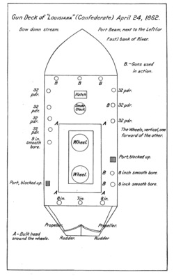 - Весьма сомнительное заявление: «Луизиана» представляла собой слишком маленькую мишень, чтобы навесной огонь мортир имел реальные шансы поразить её, и эту угрозу легко было нейтрализовать, держа броненосец в движении; то спуская его ниже по течению, то буксируя выше.
