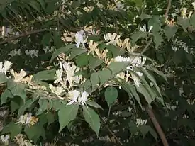 Листья и цветки жимолости Маака, на которой развиваются гусеницы моли Caloptilia orientalis