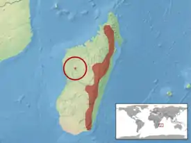 Вид является эндемиком Мадагаскара. Он широко распространён на востоке острова в лесных массивах. Есть изолированная популяция на западе страны в заповеднике Амбохитантели (Ambohitantely)[1][2][3].