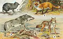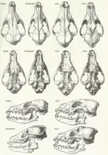 ![]() Сверху вниз: чепрачный шакал (Canini), обыкновенная лисица (Vulpini), серая лисица (базальная группа) | ||||||