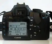 В отличие от большинства предыдущих камер серии EOS, на 400D отсутствует дополнительный информационный экран. Его функцию выполняет цветной TFT-дисплей (2,5", 230000 пикс.), на котором отображаются все параметры аппарата[1]. Камера оборудована датчиком, отключающим экран при поднесении видоискателя к глазу.