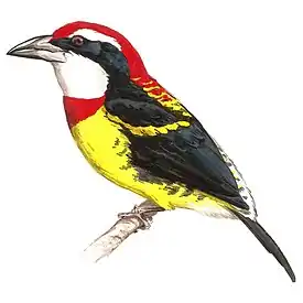 Мелкая птица длиной до 19 см. Верхняя часть головы и шея красная. Узкая чёрная полоса отделяет красный лоб от клюва; эта полоса расширяется в верхней части головы и проходит через глаза к бокам шеи. Передняя верхняя часть тела чёрная с боков, посередине спины красный цвет переходит на жёлтый, затем в желтовато-белый. Хвост верхней стороны чёрный, с нижней стороны — коричневый. Горло и верхняя часть груди белые. На груди проходит широкая красная полоса. Брюхо жёлтое, подхвостье белое. Самки похожи на самцов, но имеют белые пятнышки на чёрной полосе у глаз.