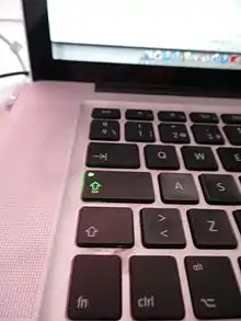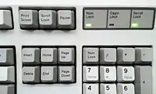 Caps Lock (сокращение от англ. capitals lock — «фиксация прописных букв») — клавиша компьютерной клавиатуры, предназначенная для фиксации смены регистра букв со строчных на прописные. В раскладках QWERTY и Дворака она располагается с краю слева между клавишами Tab ↹ и ⇧ Shift. Для индикации режима Caps Lock на большинстве клавиатур имеется светодиод, который может располагаться в правом верхнем углу клавиатуры (наряду со светодиодами Num Lock и Scroll Lock), возле самой клавиши ⇪ Caps Lock, или прямо на ней.