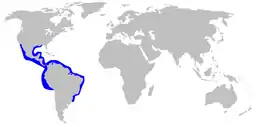 Ареал Carcharhinus porosus простирается от севера Мексиканского залива до южного побережья Бразилии, за исключением островов Карибского бассейна[11]. Этот вид наиболее часто встречается вдоль северного побережья Бразилии, у берегов Пара и Мараньяна, где он является наиболее распространённым видом акул[2][13]. За последние 50 лет Carcharhinus porosus не встречались к востоку от реки Миссисипи, несмотря на исторические свидетельства существования природных питомников этого вида в прибрежной зоне Луизианы[5]. Carcharhinus porosus обычно можно обнаружить у дна в прибрежных водах не глубже 36 м. У берегов северной Бразилии среда обитания характеризуется мощными приливами до 7 м в высоту, изменяющейся солёностью воды, которая варьируется от 14 ‰ в сезон дождей до 34 ‰ в сухой сезон и температурными колебаниями от 25 °C до 32 °C. Этот вид предпочитает эстуарии с илистым дном[2].