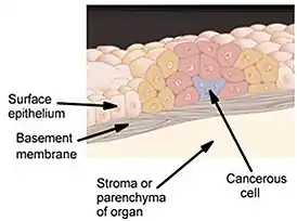 Carcinoma in situ (лат. carcinoma in situ — рак на месте), преинвазивный рак, внутриэпителиальный рак или рак 0 стадии — злокачественная опухоль на начальных стадиях развития, особенностью которой является скопление гистологически измененных клеток без прорастания в подлежащую ткань. Считается, что рак in situ находится в динамическом равновесии [2] — клетки опухоли гибнут с такой же скоростью, как и пролиферируют, отличается своей бессосудистой стадией развития. Характеризуется, как правило, небольшими размерами, отсутствием клинических проявлений, очень медленным ростом и отсутствием метастазов. Также «раком на месте» может называться результат успешного лечения — химиотерапии и/или лучевой терапии или самопроизвольного уменьшения опухоли. В этом случае растущая ранее опухоль останавливается в росте или даже уменьшается, иногда до почти полного исчезновения. Рак in situ никак себя не проявляет и обнаруживается, как правило, случайно, когда проводится гистологический срез или биопсия. До момента начала активного роста может пройти значительное время — вплоть до нескольких десятков лет. Чаще всего эта опухоль образуется из плоских эпителиальных тканей, молочной железы, мочевыводящих путей, слизистой оболочки матки, предстательной железы.