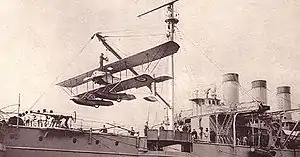 Гидросамолет фирмы Caudron поднимается краном на борт крейсера La Foudre, апрель 1914