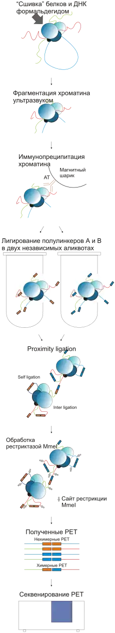 Комплексы ДНК-белок неспецифически сшиваются с помощью формальдегида. Образец подвергается воздействию ультразвука, при этом молекулы ДНК дробятся на фрагменты и разрушаются непрочно связавшиеся неспецифические комплексы. В результате получаются фрагменты ДНК в прочных комплексах с белками. Далее с помощью специфических антител, закрепленных на магнитных шариках, преципитируются фрагменты хроматина, связанные с интересующим белком. Часто объектами исследования являются известные транскрипционные факторы[1]. Преципитированные комплексы извлекаются из раствора за магнитные шарики при помощи магнита. Выделенные комплексы разделяются на 2 аликвоты и на концы молекул ДНК «пришиваются» олигонуклеотидные полулинкеры с известной последовательностью. В одной аликвоте — полулинкер А, в другой — полулинкер В. Оба полулинкера содержат сайт, узнаваемый рестриктазой MmeI, и отличаются друг от друга «баркодом» (barcode) из двух нуклеотидов: CG для полулинкера А, и AT для полулинкера В. В результате в дальнейшем при секвенировании можно отличить линкеры друг от друга по «баркоду». На следующем этапе две аликвоты объединяются и происходит проксимальное лигирование, в результате которого полулинкеры лигируются друг на друга с образованием линкеров полной длины. Линкеры с АА (CG/CG) или BB (AT/AT) «баркодами» считаются вероятными продуктами лигирования внутри одного комплекса, в то время как линкеры с АВ (CG/AT) «баркодами» считаются химерными продуктами лигирования ДНК, связанной с разными белковыми комплексами Подготовка к сиквенсу включает в себя обработку комплексов рестриктазой MmeI[8], которая расщепляет ДНК на определенном расстоянии от своего сайта узнавания в полулинкере. В результате в конце этого этапа получаются конструкции, содержащие пару «тагов» (англ. tag) (по 20 п.н. каждый) с двух сторон от полного линкера (38 п.н.). Полученные фрагменты секвенируют с обоих концов(англ. PET). После этого «таги» картируются на геном.[7][9]