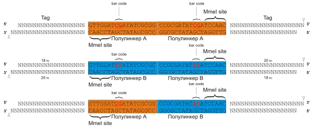 Все прочитанные последовательности разделяются на последовательности, имеющие читаемые «баркоды» и нечитаемые «баркоды». Если «баркод» не может быть прочитан, то последовательность «отбрасывается» из обработки. Если «баркод» может быть прочитан, то последовательности выравниваются по линкерам. Все полученные последовательности разделяются на химерные (образованные при лигировании ДНК из разных комплексов и содержащие линкер А/В) и нехимерные (содержащие линкер А/А или В/В). Надо заметить, что среди последовательностей, содержащих А/А или В/В также могут встречаться химерные. Далее последовательности собственно линкеров «отбрасываются» и анализируются последовательности «тагов» (РЕТs).[7][10]