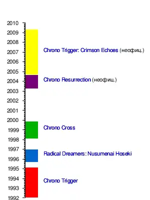 Chrono Trigger (яп. クロノ・トリガー Куроно Торига) — японская ролевая игра, разработанная и изданная компанией Square Co. и вышедшая на приставке Super Nintendo Entertainment System в 1995 году. Chrono Trigger был выпущен в Японии 11 марта 1995 года, в США — 22 августа 1995 года. Chrono Trigger был портирован на Sony PlayStation в 1999 году в Японии как отдельная игра, а в 2001 году как часть сборника Final Fantasy Chronicles в Северной Америке. Третья версия была выпущена для портативной платформы Nintendo DS 20 ноября 2008 года[9]. Сейчас Chrono Trigger считается одной из лучших игр среди когда-либо выпущенных[10].