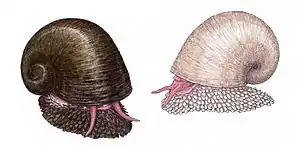 Максимальный размер раковины достигает 4,55 см (очень крупный для своего семейства моллюск), а в среднем у взрослых особей — 32 мм. Раковина с примерно 3 оборотами и очень большим эллиптическим устьем; поверхность с мелкими рёбрами. Изнутри раковина молочно-белая, снаружи чёрно-коричневая[6].