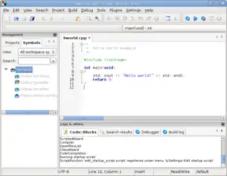 Code::Blocks — свободная кроссплатформенная среда разработки. Code::Blocks написана на C++ и использует библиотеку wxWidgets. Имея открытую архитектуру, может масштабироваться за счёт подключаемых модулей. Поддерживает языки программирования С, C++, D (с ограничениями), Fortran.