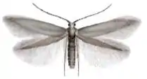 Взрослые бабочки мелкие (4-6 мм в длину и 6-10 мм размахе крыльев), очень узкие, серебристо-коричневого цвета. У них отсутствуют оцеллии и максиллярные щупики. Крылья дискальные, заостренные, с бахромой или «рваные». Имаго летают с мая по июль[6]. Голова серая; усики серо-беловатые, очень нечетко окольцованы серым. Передние и задние крылья серые[7].