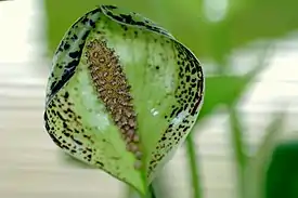 Початок репродуктивный до вершины; женская часть сросшаяся с покрывалом, смежная с мужской зоной. Цветки однополые, околоцветник отсутствует. Мужской цветок состоит из одной тычинки; нити конические, различные по размеру; пыльники верхушечные и наклонные; теки эллипсоидные, вскрывающиеся разрезом; пыльца сферическая, среднего размера (39 мкм). Женский цветок: гинецей окружён разнообразными синандродиями, наподобие чашечки; завязь яйцевидно-элипсоидная, одногнёздная; семяпочка одна, ортотропная; фуникул короткий; плацента базальная; столбик короткий, сужающийся; рыльце дисковидно-головчатое.
