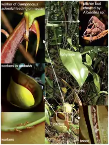 Муравьи делают свои гнёзда в полых усиках-стебельках кувшинчиков Nepenthes bicalcarata (Nepenthaceae) и ныряют в их пищеварительную жидкость за отловом попавших туда насекомых[6][7][8]. Это уникальное взаимодействие растений и муравьёв впервые было замечено ботаником Фредериком Уильмом Бербиджем в 1880 году[9]. В 1904 году итальянский натуралист Одоардо Беккари (Odoardo Beccari, 1843—1920) предположил, что муравьи питаются насекомыми, которых они находят на этих растениях, но могут и сами стать их жертвой[10]. В 1990 году Б. Холлдоблер и Э. Уилсон предположили, что N. bicalcarata и C. schmitzi формируют взаимовыгодную мутуалистическую ассоциацию[11]. Однако, в то время это была лишь гипотеза, не подтверждённая экспериментально. Серия наблюдений и экспериментов была проведена в Брунее австралийским экологом и ботаником Чарльзом Кларком в 1992 и 1998 годах[12][13][14] и Кларком и Р. Китчингом (R. L. Kitching) в 1993 и 1995 гг[15][16], что в значительной степени подтвердило мутуалистическую природу их взаимоотношений.