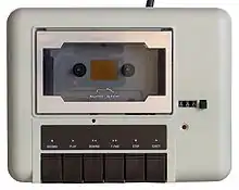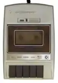 - Белый корпус оригинальной формы, чёрная крышка кассеты, пять чёрных клавиш; есть счётчик расхода ленты, нет индикатора режима записи
