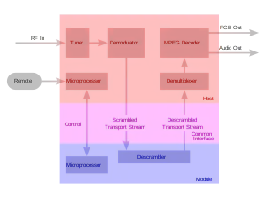 - CAM-модуль — вставляемое в CI-слот стандартное переходное устройство для подключения карт декодирования закрытых каналов. Для каждого типа кодировки (Viaccess, Conax, Irdeto и пр.) существует соответствующий CAM-модуль.
