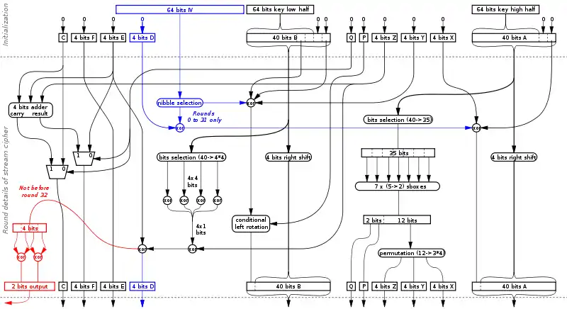 Первые 32 раунда поточного шифра используются для инициализации, и не формирует никаких выходных данных. Первые 64 бит данных используются в качестве вектора инициализации во время этой фазы и остаются неизменными. Потоковый шифр генерирует 2 бита псевдослучайного потока на каждом раунде, которые складываются операцией XOR с данными, начиная с 64 бита пакета[3].