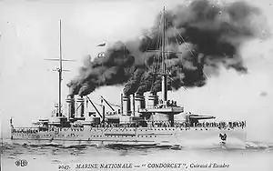 Когда в августе 1914 года началась Первая мировая война, «Кондорсе» участвовал в поисках немецкого линейного крейсера «Гебен» и легкого крейсера «Бреслау» в Западном и Центральном Средиземноморье. Позже в том же месяце принял участие в потоплении австро-венгерского крейсера «Зента» в Адриатическом море. Большую часть войны корабль блокировал Проливы Отранто и Дарданеллы, препятствуя выходу немецких, австро-венгерских и турецких военных кораблей в Средиземное море.