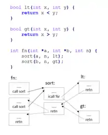 Для прямых переходов количество возможных адресов, на которые может быть передано управление, будет соответствовать количеству функций в программе. Также при учёте системы типов и семантики языка программирования, на котором написан исходный код, возможны дополнительные ограничения[16]. Например, в языке C++ в корректной программе указатель на функцию, используемый при косвенном вызове, должен содержать адрес функции с таким же типом, как и у самого указателя[17].