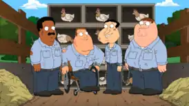 - После того, как Питера, Гленна, Кливленда и Джо арестовывают за хранение наркотиков, всех их доставляют в суд, где в качестве присяжных выступают персонажи из популярного мультсериала канала FOX — «Симпсоны».[3][5]